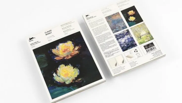 Skrivblock som innehåller 64 ark av 120g premiumpapper i elfenbenston, där hälften är linjerade och hälften är blanka. De kan användas för handskrift, teckning eller köras genom en skrivare. Baksidan av arken är dekorerad med fyra olika mönster per block, 16 ark av varje design. Motiven på det här blocket är konstverk av Claude Monet.