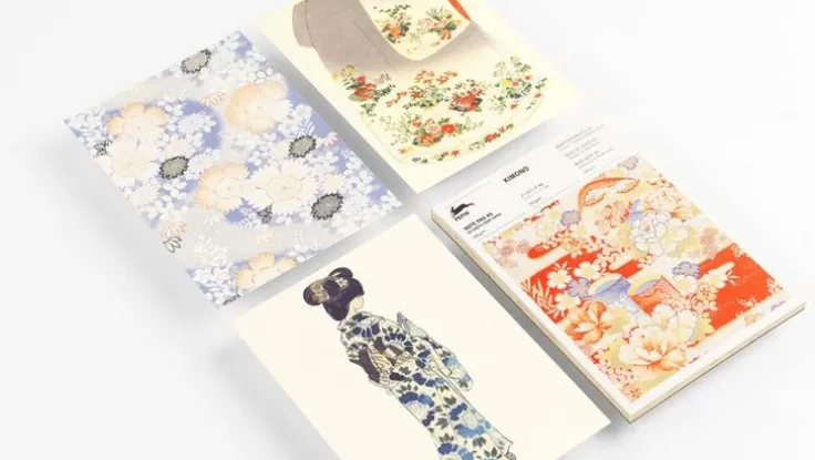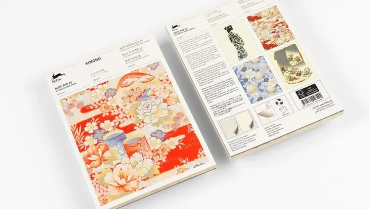 Skrivblock som innehåller 64 ark av 120g premiumpapper i elfenbenston, där hälften är linjerade och hälften är blanka. De kan användas för handskrift, teckning eller köras genom en skrivare. Baksidan av arken är dekorerad med fyra olika mönster per block, 16 ark av varje design. Motiven på det här blocket är hämtade från japanska kimonos.