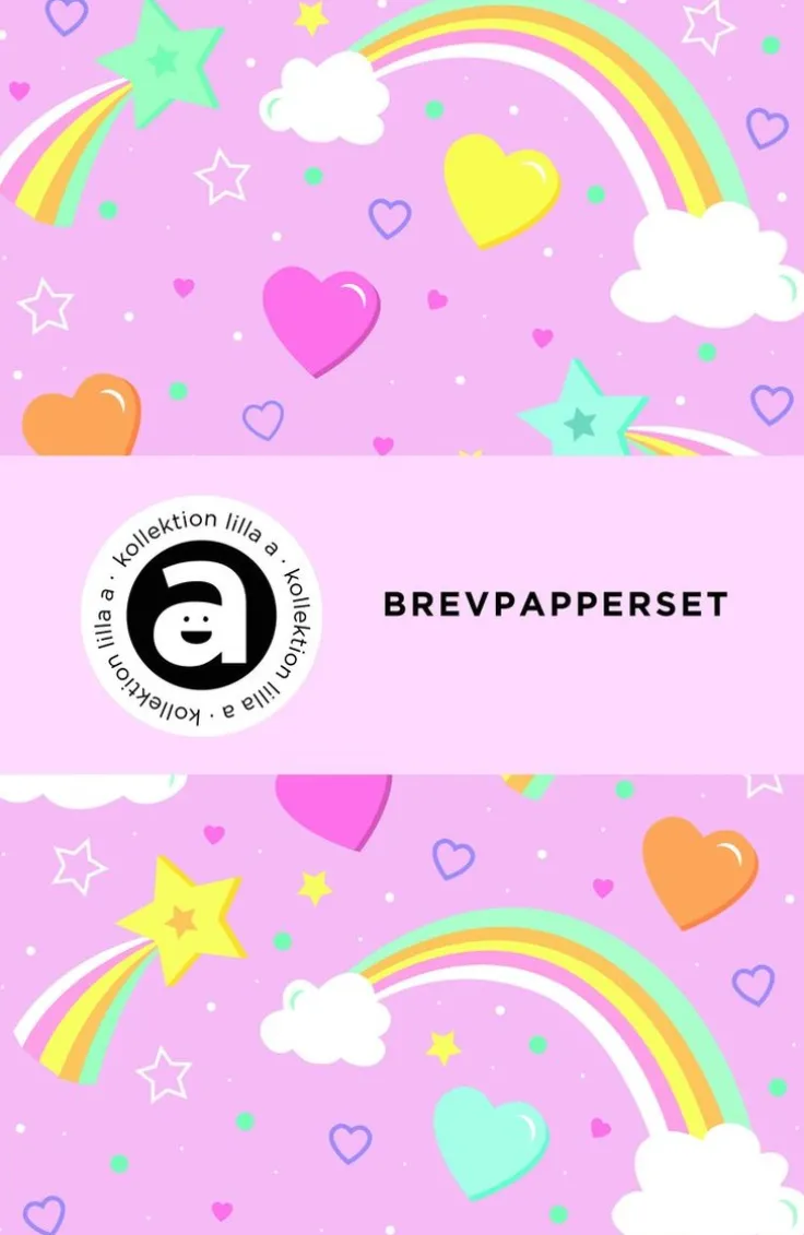 Brevset i regnbågstema innehållande 12 linjerade blad och 8 kuvert. Brevsetet ingår i Akademibokhandelns egen kollektion – Kollektion lilla a.