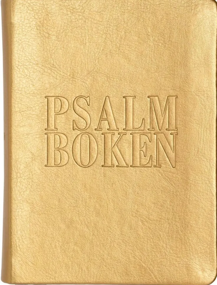 Den svenska psalmboken med tillägg, guldinnehåller:melodipsalmbok med psalmerna 1-700 och psalmerna 701-800 i tillägget och ackordanalys för piano och gitarr. Register samlade längst bak i boken, med psalmversregistret allra sist. Evangeliebok och kyrkohandboksutdrag är tydligt markerade i kanten.