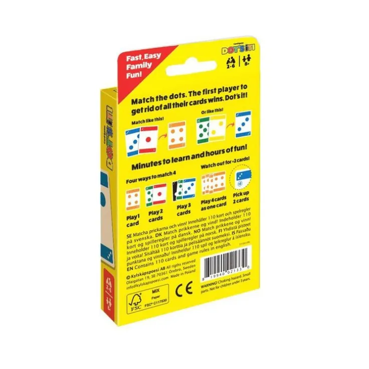 DOT´S IT!DOT´S IT! är ett helfestligt spel som passar hela familjen. Lägg ut kort som matchar antalet prickar på översta kortet. Den första spelaren som blir av med alla sina kort och säger ”DOT´S IT!” vinner.DOT´S IT! är ett snabbt och kul familjespel som är perfekt på semestern, i fjällstugan eller varför inte på stranden eller hemma i soffan. Utmana dina vänner, familjemedlemmar eller kollegor på en enkel och rolig spelkväll. Här mixar man tur med taktik och med hjälp av olika specialkort kan man ställa till det för sina motståndare.