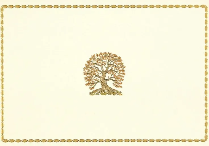 Dubbelvikta kort i stadig ask och med transparent lock. Asken innehåller 14 dubbelvikta kort och 15 matchande kuvert. Korten är blanka inuti för ditt personliga meddelande. Korten har en linneliknande utsida och är dekorerade med guldfolie. På insidan är kortet slätt, så att det går lätt att skriva. Korten är 13 cm breda och 9 cm höga. Designen visar ett vackert livets träd, dekorerat och inramat med guldfolie.
