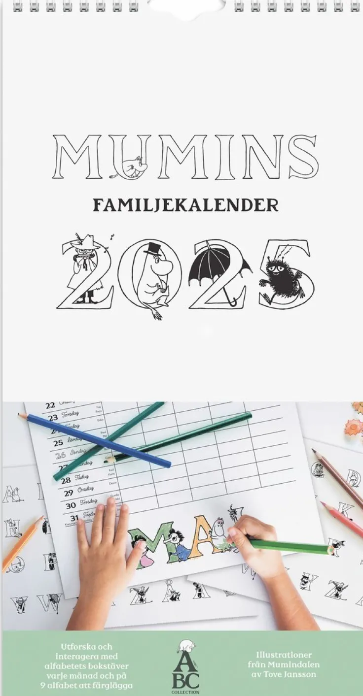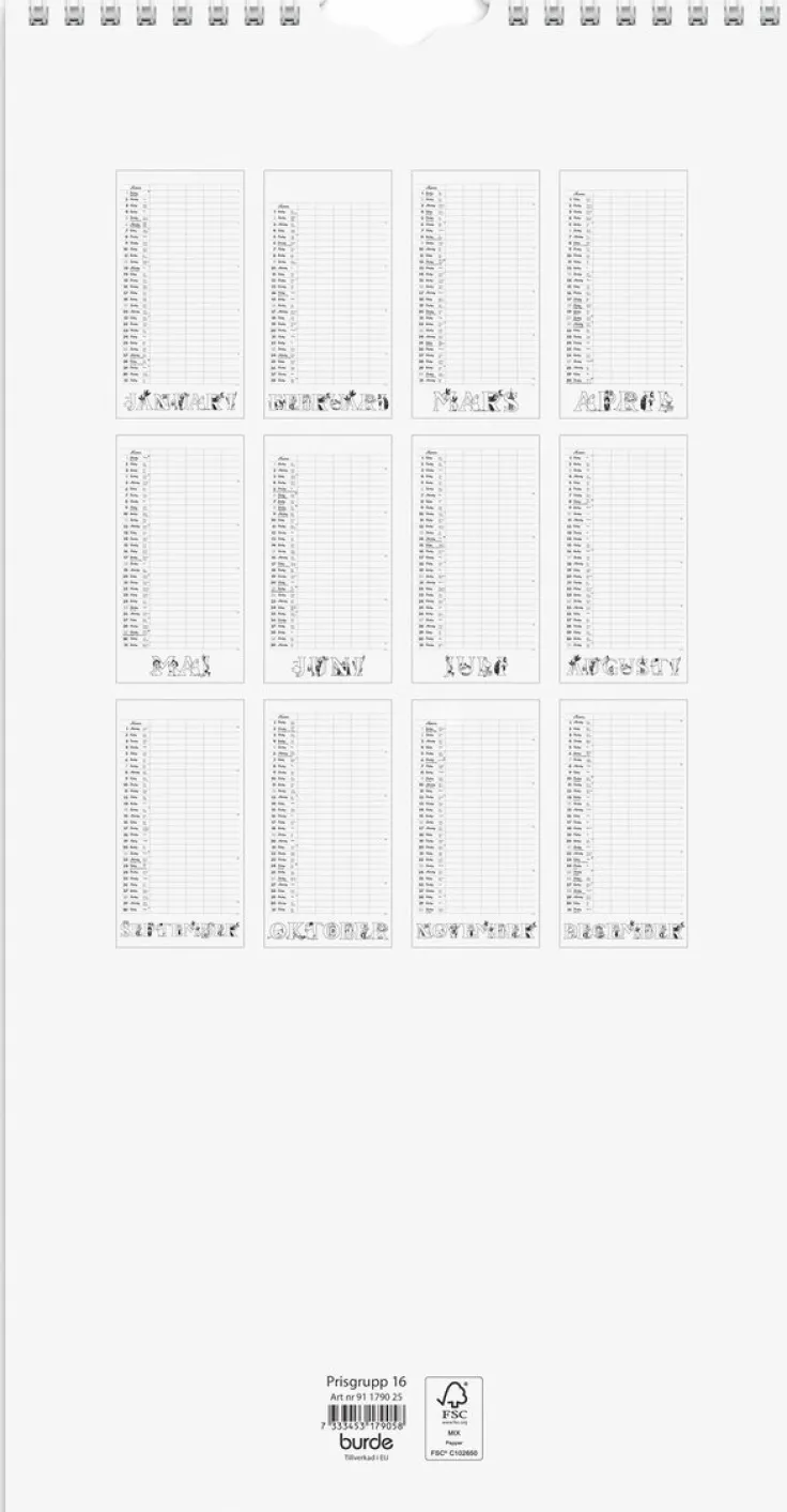 En väggkalender med fem kolumner för att lättare kunna planera och organisera ditt livspussel, du kan själv skapa kalenders funktion utifrån dina behov. Antingen dela in livet i aktiviteter, matlistor, födelsedagar eller dela in den utifrån familjemedlemmarna i hemmet. Vad som passar bäst i just ert hem. Kalenderns design visar illustrationer gjorda över älskade muminkaraktärerna.Familjekalender 2025 från Burde. Format: 220×430 mm. Layout: Månad/blad. Kalendarium: 45658 – 46022. Spiralbunden. Innehåll: Fem kolumner. Antal sidor: 15. Miljöinformation: FSC®.