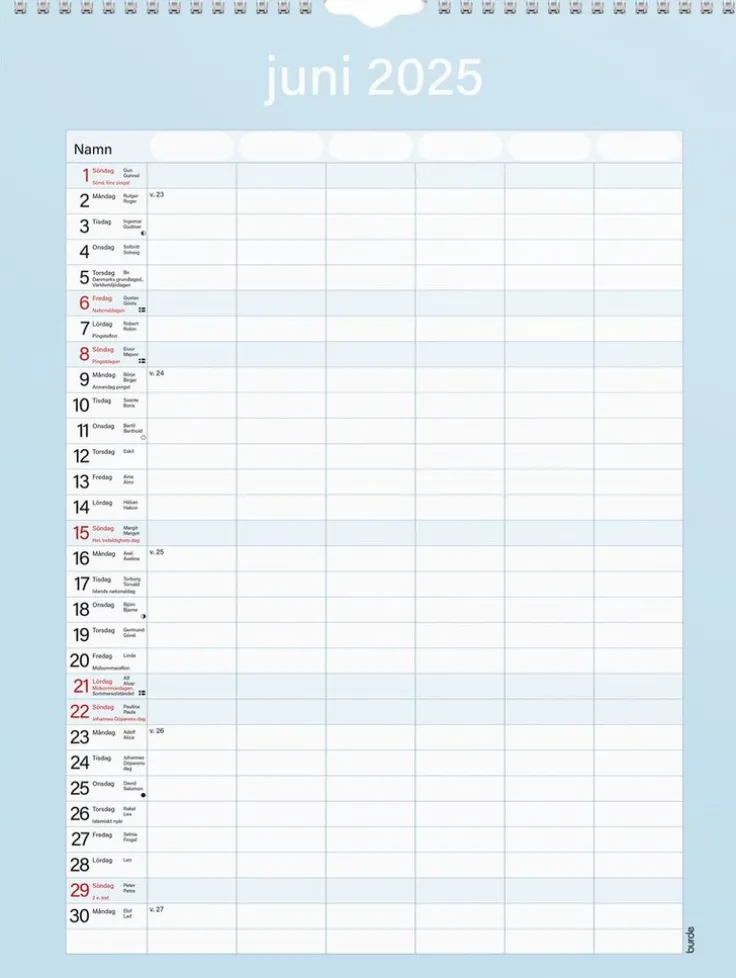 Familjekalender 2025 från Burde. Format: 295×390 mm. Layout: Månad/blad. Kalendarium: 2025-01-01 – 2025-12-31. Spiralbunden. Innehåll: Sex kolumner. Antal sidor: 12. Miljöinformation: FSC®.