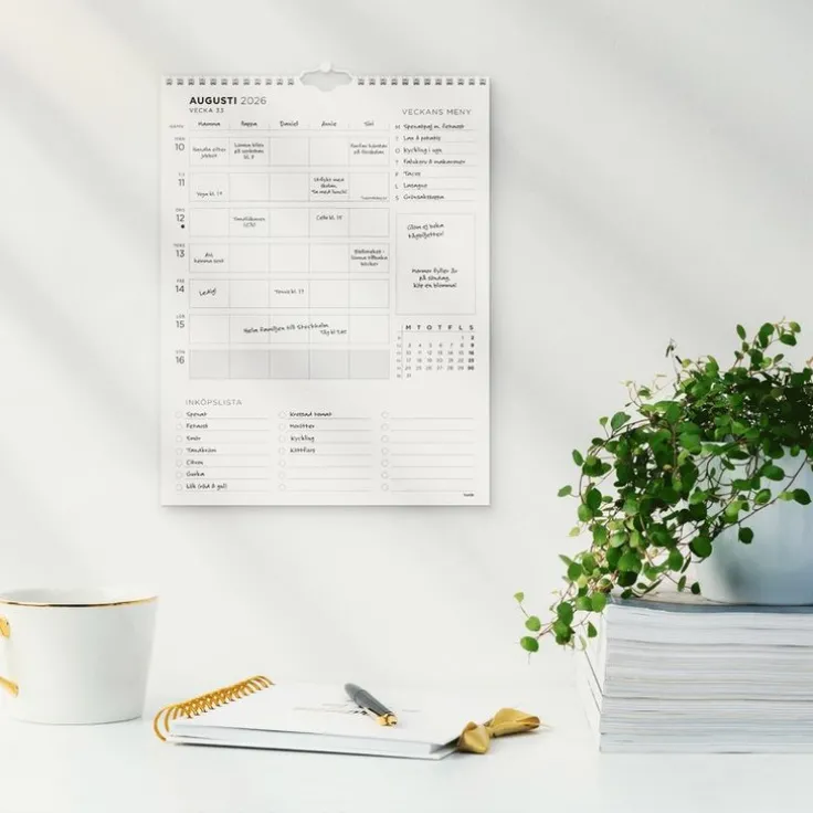 Letar du också efter en väggkalander som kan täcka alla dina planeringsbehov? En familjekalender som hjälper dig att planera för olika aktiviteter, olika familjmedlemmar, maten för veckan, att-göra, kom-ihåg samt vad ni ska handla och alla andra behov ni har för att strukturera och göra livspusslet lite lättare att hantera. Väggkalendern kommer med en avrivningsbar del som gör att du lätt får med dig din shoppinglista till affären eller varför inte skriva ner ett fint meddelande som du kan skicka med en familjemedlem till jobbet eller skolan.>Familjekalender 2026 från Burde. Format: 230×300 mm. Layout: Vecka/uppslag. Kalendarium: 2025-12-29 – 2027-01-03. Spiralbunden. Innehåll: Flaggdagar, helgdagar/aftnar, månfaser, namnsdagsregister, temadagar/händelser, 5 kolumner. Antal sidor: 106. Miljöinformation: FSC®.
