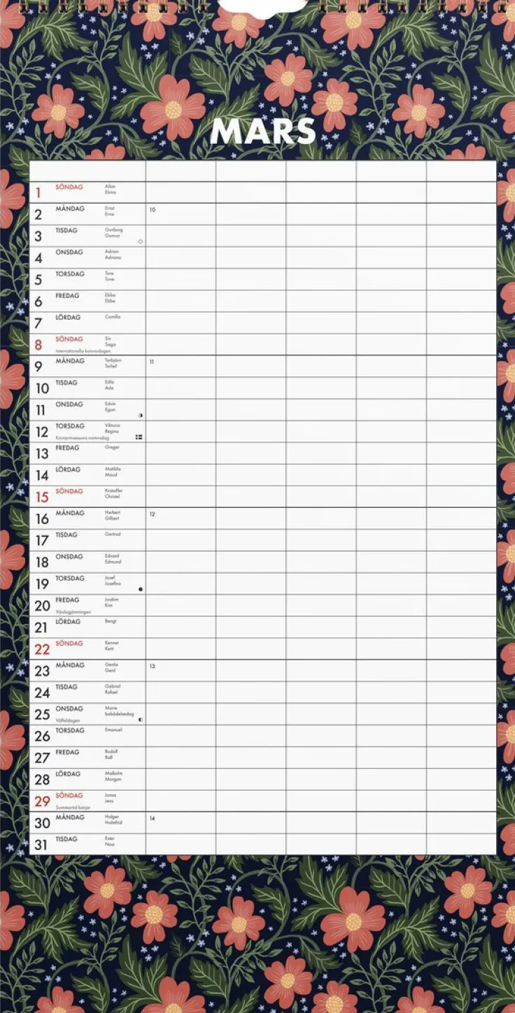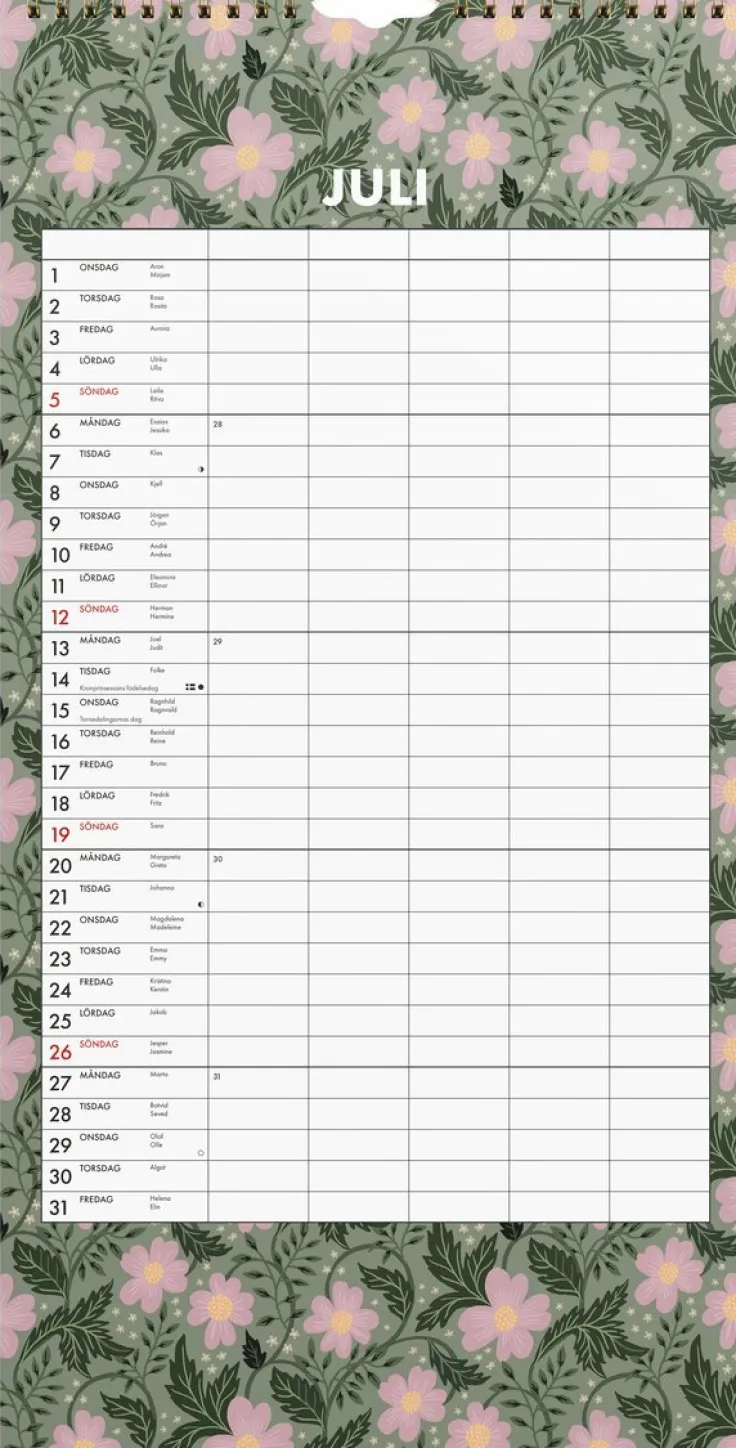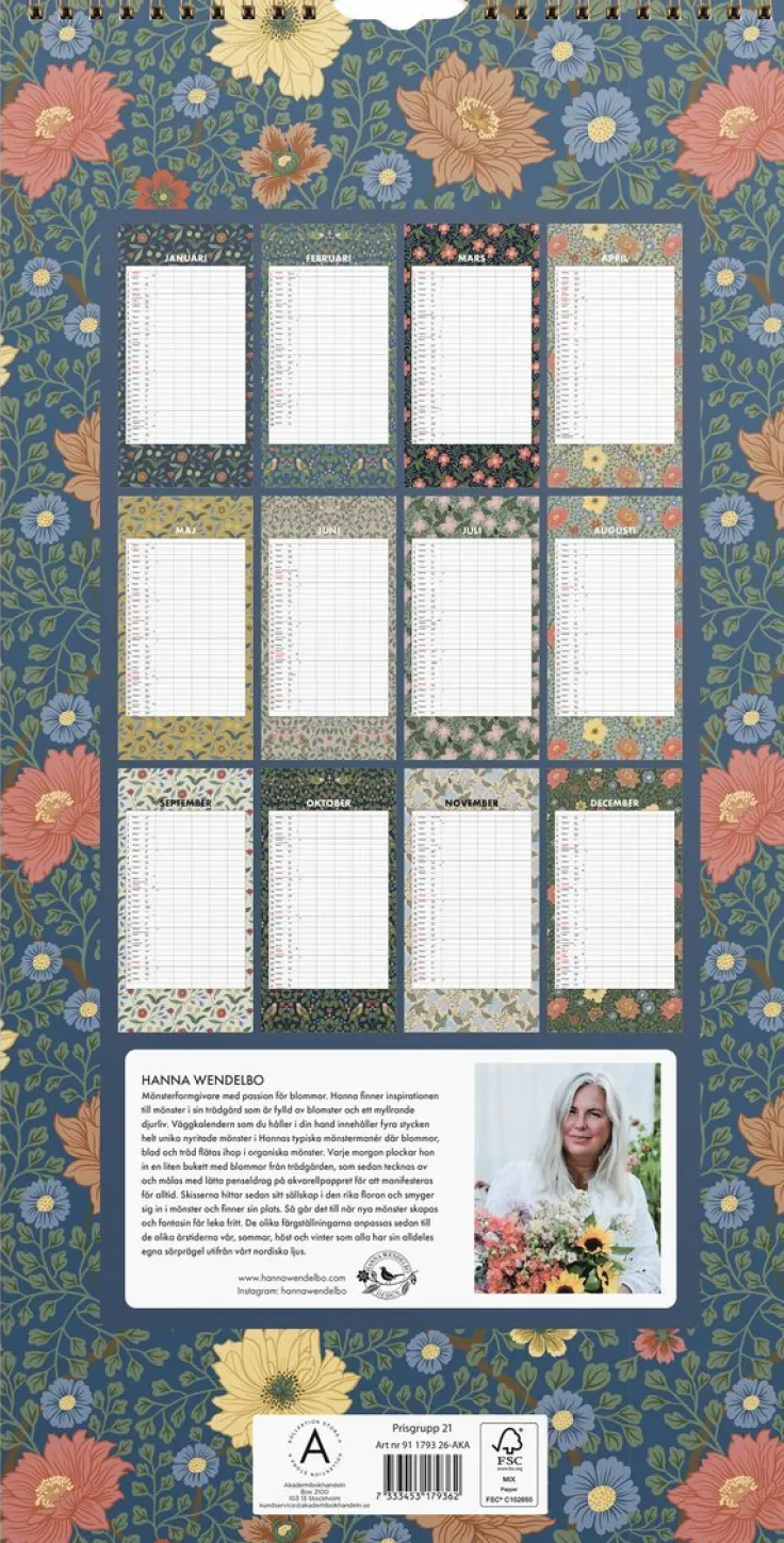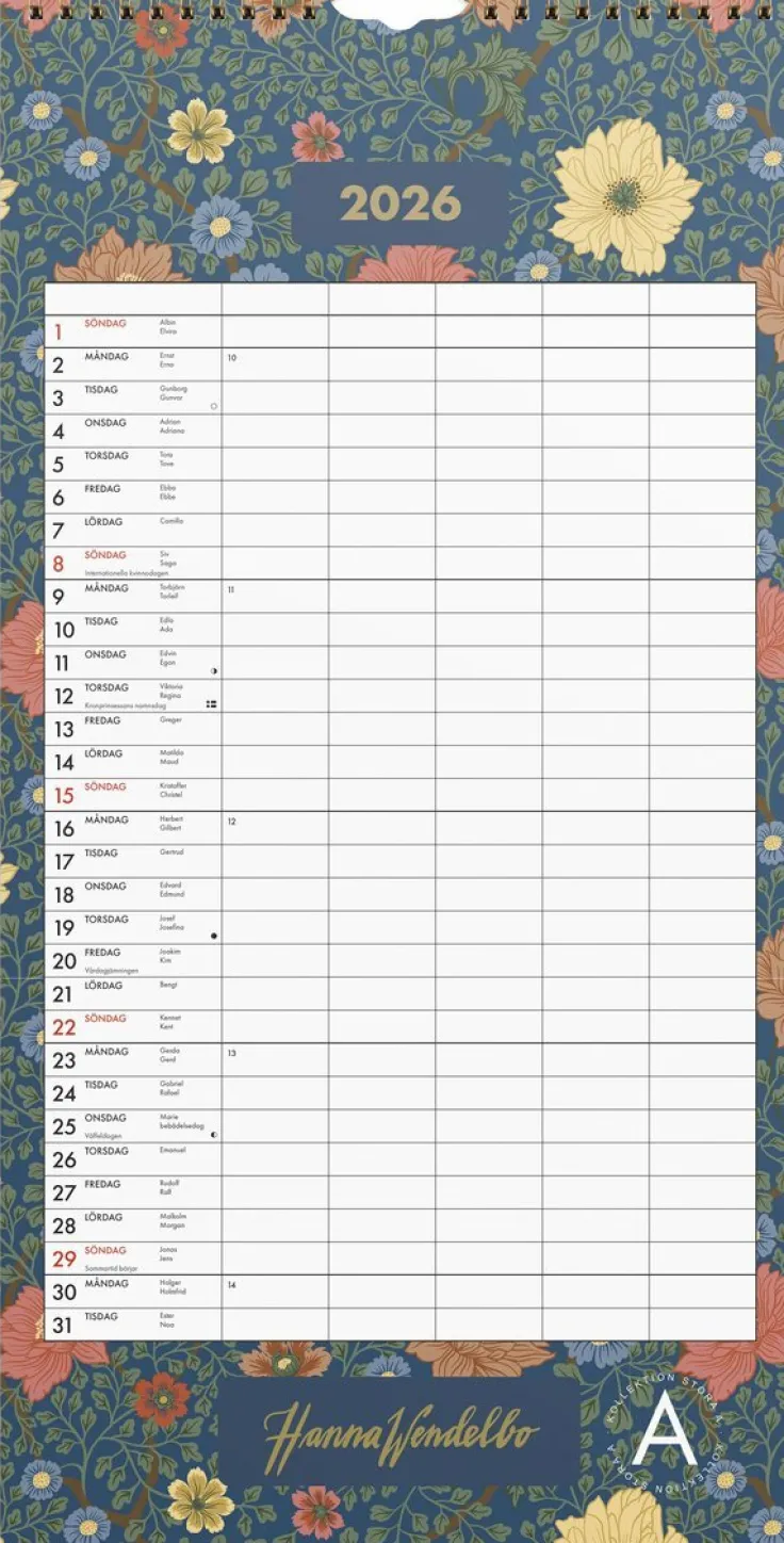 En familjekalender 2026 med Hanna Wendelbos underbara mönster. Kalendern har fem kolumner. Låt barnen fylla i sin egen kolumn och häng den fina almanackan där alla ser den. På så sätt blir hela familjen delaktig i varandras planer och ni kan påminna varandra om vad som är på gång. Med kalenderns fina designade mönster blir den till en vackert blickfång i ert hem!Hanna Wendelbo är designer och formgivare som ritar mönster för tyger, tapeter, kläder och nu även för kalendrar. Hon har även gett ut böcker om blommor, kreativitet och odling.Format: 220×430 mm. Layout: Månad/blad. Spiralbunden. Antal sidor: 12. Miljöinformation: FSC®.