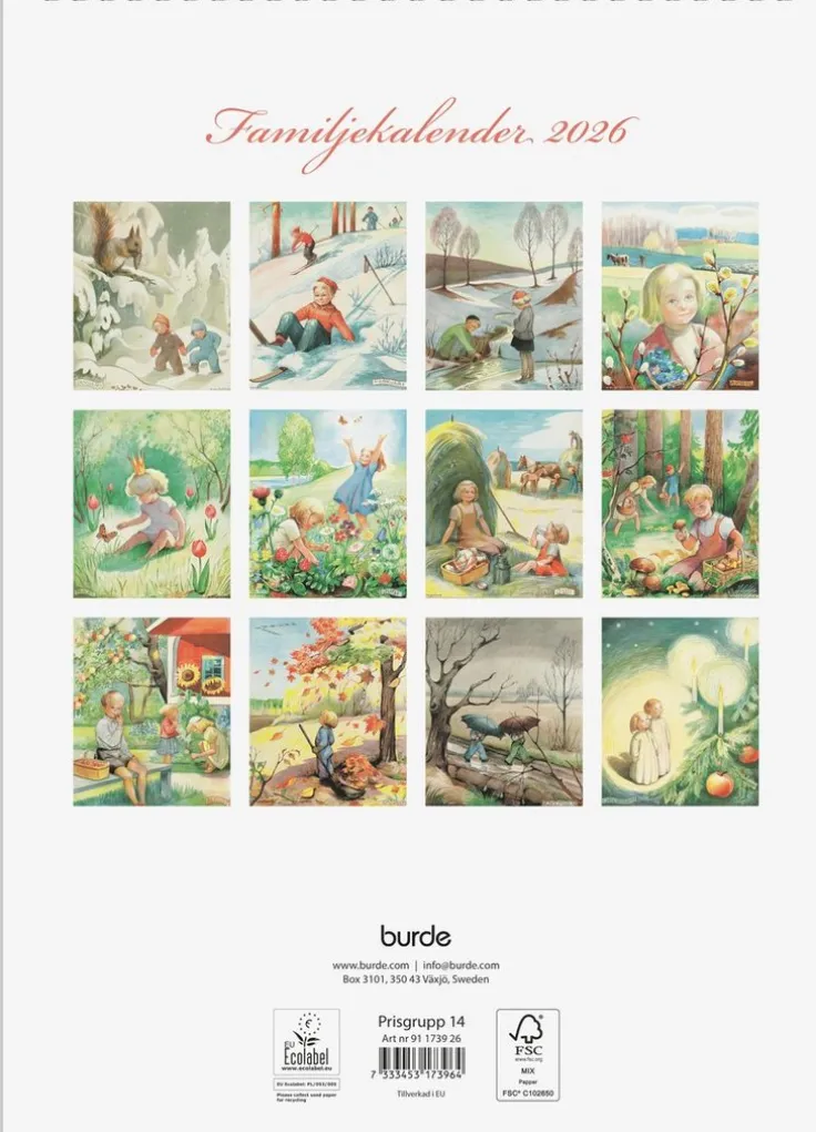 Följ årets månader med de vackra klassiska motiven som är illustrerade av Kerstin Frykstrand. Familjekalender med 4 kolumner som underlättar planeringen.>Familjekalender 2026 från Burde. Format: A4. Layout: Månad/blad. Kalendarium: 2026-01-01 – 2026-12-31. Spiralbunden. Innehåll: Flaggdagar, helgdagar/aftnar, månfaser, namnsdagar, temadagar/händelser, 4 kolumner. Antal sidor: 12. Miljöinformation: FSC®. Ecolabel.