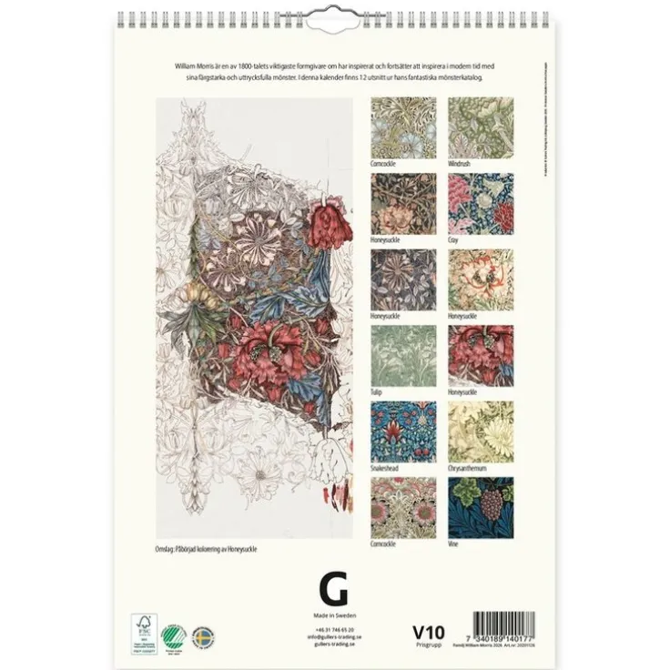 Familjekalender med William Morris vackra mönster. Kalendern har 6 kolumner för hela familjens aktiviteter. Svenska namndagar och helgdagar. Kalendern är producerad och tryckt i Sverige på svenskt papper. Märkt med både Svanen och FSC.