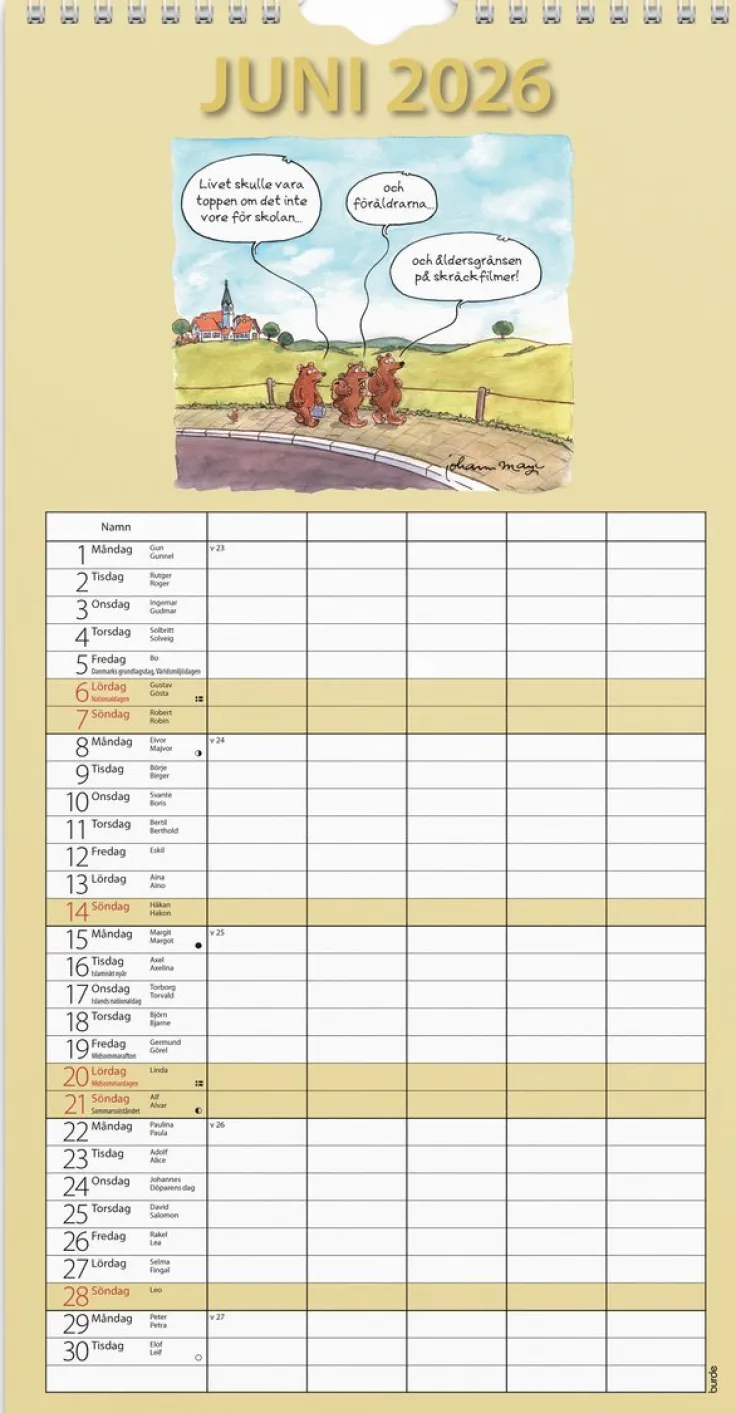 Familjekalender 2026 från Burde. Format: 220×430 mm. Layout: Månad/blad. Kalendarium: 2026-01-01 – 2026-12-31. Spiralbunden. Detaljer: Pappersficka. Innehåll: Flaggdagar, helgdagar/aftnar, månfaser, namnsdagar, temadagar/händelser, 5 kolumner. Antal sidor: 12. Miljöinformation: FSC®.