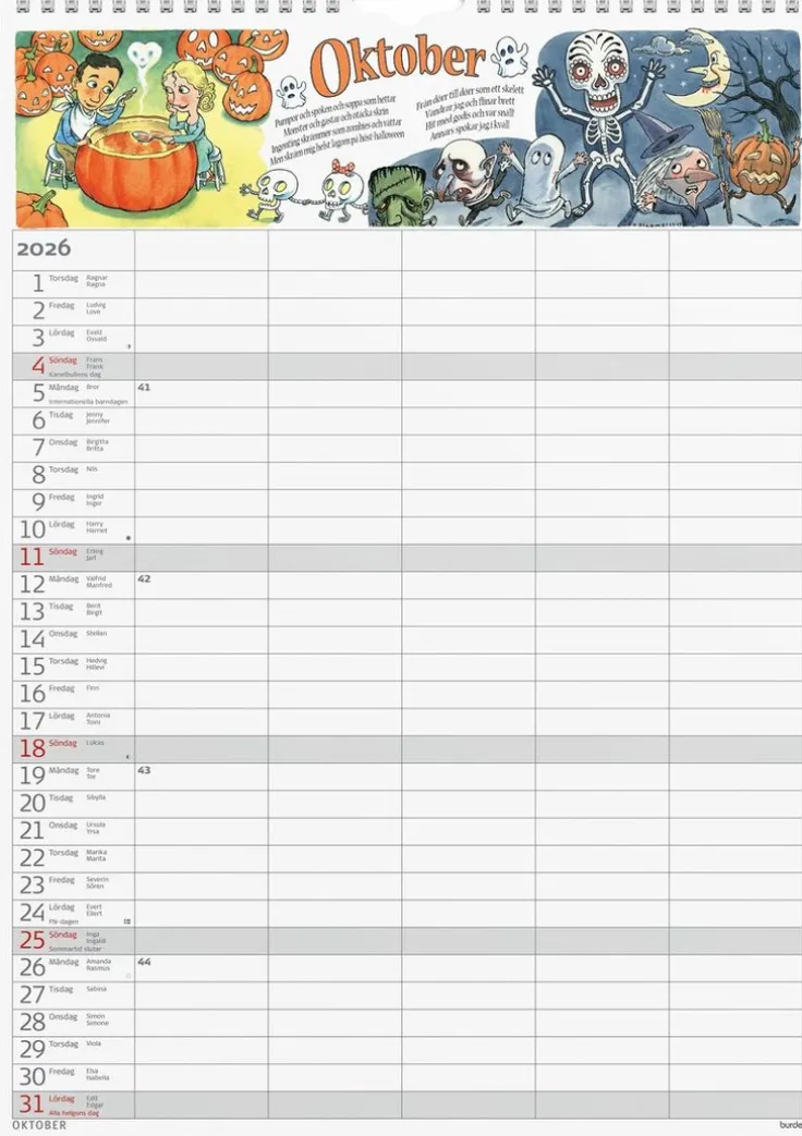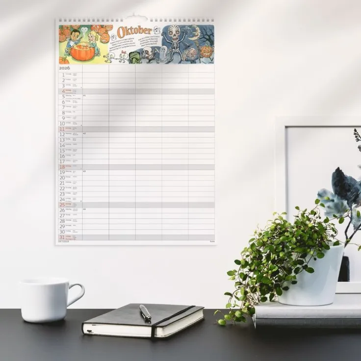 Nu blir det roligt för hela familjen att vara med och planera! I denna familjekalender kan du blanda att göra och kom ihåg med roliga rim och massor av stickers som barnen själva får sätta vid sina aktiviteter. Med fem kolumner finns det plats för hela familjens planer och det blir enkelt att se vad alla har på gång.>Familjekalender 2026 från Burde. Format: A3. Layout: Månad/blad. Kalendarium: 2026-01-01 – 2026-12-31. Spiralbunden. Innehåll: Flaggdagar, helgdagar/aftnar, månfaser, namnsdagar, temadagar/händelser, årsplan/årsplaner, 5 kolumner, stickersark. Antal sidor: 12. Miljöinformation: FSC®.