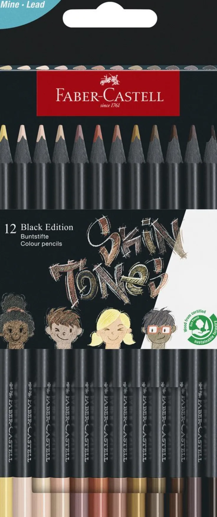 Black Edition färgpennor är älskade jorden runt tack vare sin triangulärt ergonomiska form vilket också gör den perfekt för höger- som vänsterhänta. Dett set innehåller 12 fantastiska hudtoner med extremt mjuka stift som skapar en supermjuk färgläggning. Pennorna gör sig lika bra på ljust som mörkt eller färgat papper. De har extremt brytstarka stift tack vare den speciella hellimningsprocessen (SV). Vattenbaserat och miljövänligt lack. Svart trä rakt igenom med tydlig färgindikator. Trä från hållbart och certifierat skogsbruk (FSC).