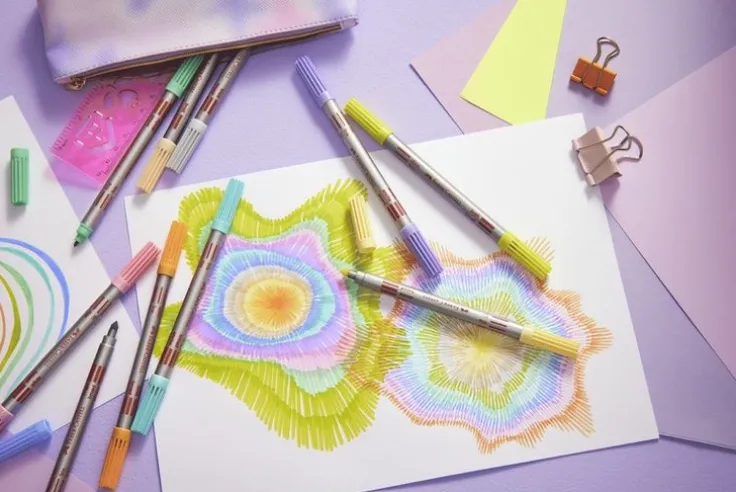 En mycket uppskattat tuschpenna som ger valuta för pengarna. Pennan har en dubbelspets med tåliga spetsar för en obegränsad kreativitet. Bred spets för färgläggning och en smal spets för detaljarbete och konturer. Ventilerade säkerhetshuvar på båda sidor. Vattenbaserat bläck som enkelt kan tvättas bort från textiler och hud. Detta set innehåller 10st härliga pastellfärger.