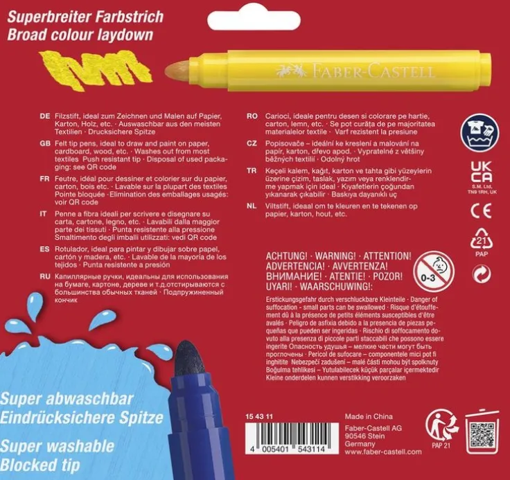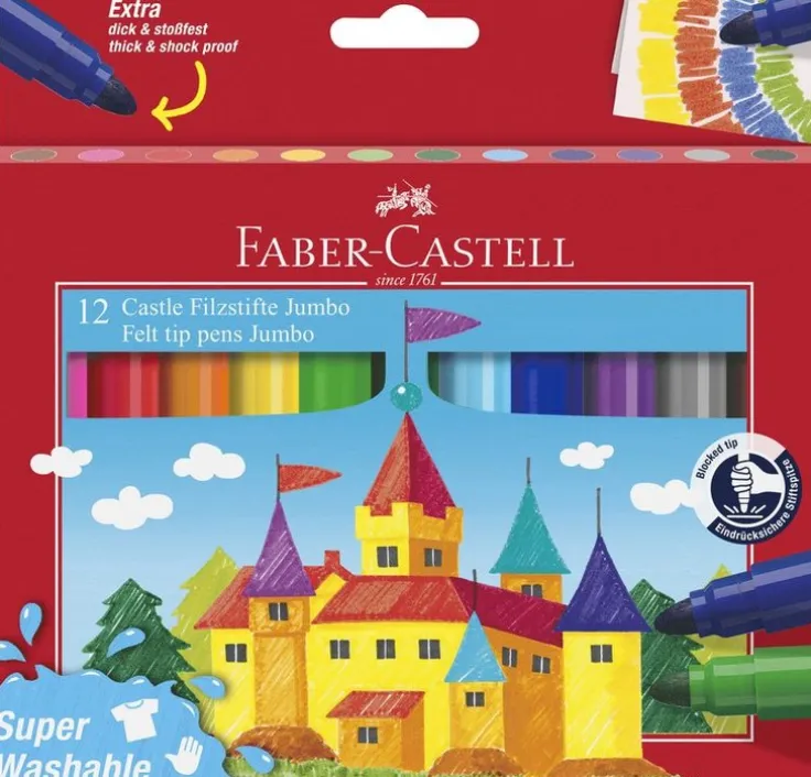 En tålig fiberpenna i rund pennkropp och Jumbostorlek som sitter klockrent I barnhanden. Har en mycket stark och tålig spets som är extra förstärkt så att inget bläck läcker ut. Mycket lätt att få bort från hud och textiler. Säkerhetsventilerad huv och CE-märkt. Förpackning som innehåller alla 12 basfärger. Läs mer om våra pennor i pennguiden här.