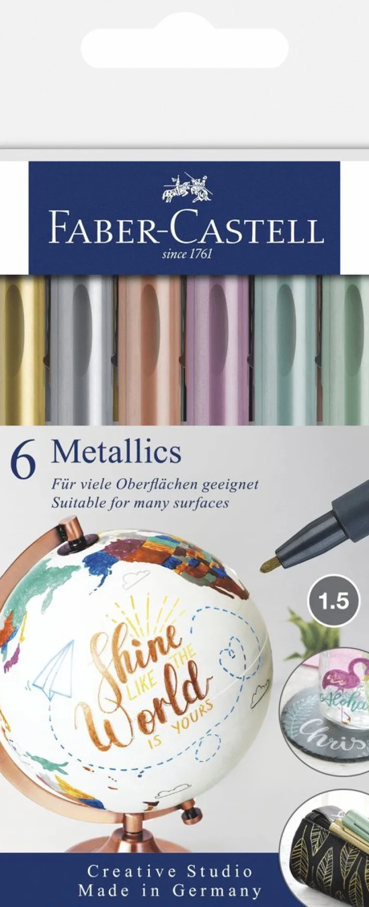Metallic marker i 6 färger på blisterkort. För användning på papper, kartong, plast, glas, porslin, metall, sten m.m. Blöder inte igenom papper. Vattenbaserat & luktfritt bläck som inte smetar. 1,5 mm spets inget pumpande eller skakande nödvändigt.