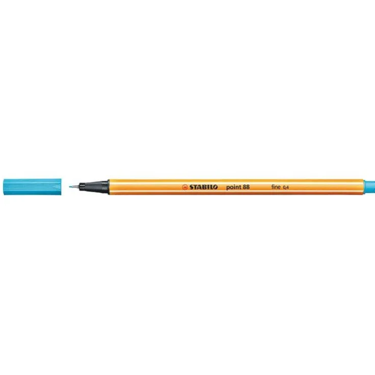 STABILO point 88 fineliner. Det är den enda finelinern som finns i så många som 47 olika färger. Skrivspetsen är metallomsluten för en längre livslängd för pennan. Med STABILO point 88 skrivs tunna fina linjer utan risk för att färgen smetas ut. Pennan är sexkantigt utformad med en lång ”cap off” tid och ventilerad huv och har en pennspets på 0,4 mm.