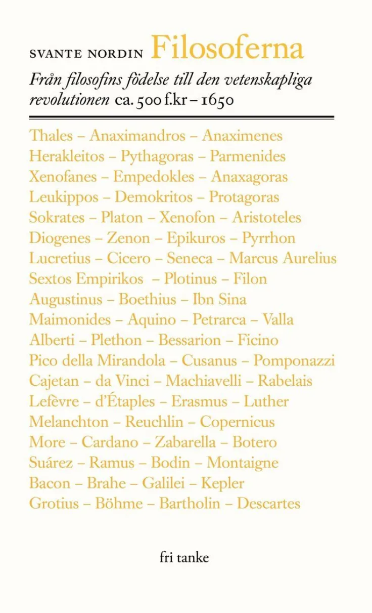 Filosoferna: Från filosofins födelse till den vetenskapliga revolutionen omfattar tusen år av tänkande. Svante Nordin skildrar här den västerländska filosofins uppkomst hos grekerna och dess meanderlopp fram till den vetenskapliga revolutionen, som på samma gång innebar filosofins största triumf och slutet för dess hegemoni. Boken är det fjärde och avslutande bandet i Nordins svit över filosofins historia.