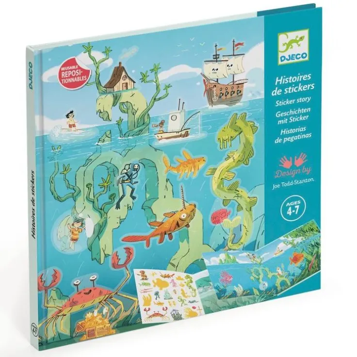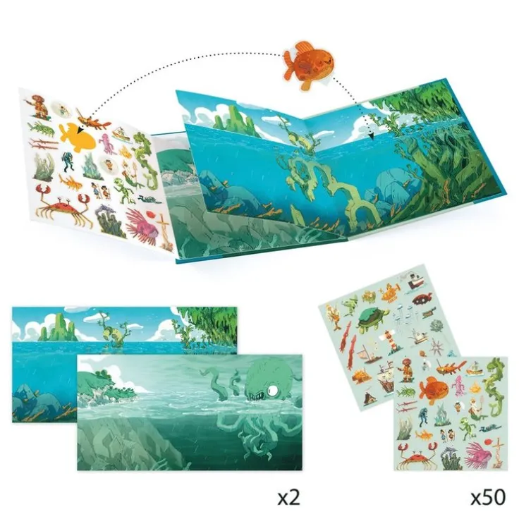 Ett inspirerande set med två stora bakgrundsbilder av havets djup samt ett brett urval klistermärken som kan flyttas om och om igen för att skapa nya bilder och väcka otaliga spännande berättelser till liv. Setet består av en lättanvänd och stadig mapp där du kan bläddra mellan de två 22 x 44 cm stora bilderna som föreställer en solig och en molnig havskust som är redo att befolkas av de fantasifulla figurerna på klistermärkena. Dessutom har mappen två utvikbara sidor med siluetter som motsvarar var och en av de cirka 50 återanvändbara klistermärkena så att de kan förvaras strukturerat när de inte används och alltid finnas till hands samt vara enkla att hitta. Det här är en rolig och kladdfri aktivitet som dessutom är lätt att ta med sig överallt i den miljövänliga mappen av FSC®? certifierad kartong. Innehåll: 1 stadig mapp med två stora bakgrunder (22 x 44 cm utvikta) och runt 50 återanvändbara klistermärken i vinyl.