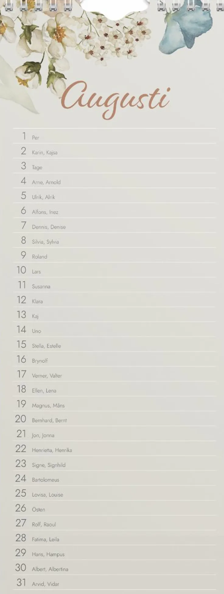 En odaterad kalender som kan hänga på väggen år efter år som ett komplement till den dagliga planeringen. Kalendern är ett perfekt ställe att fylla i vem som fyller år eller andra minnesvärda dagar som firas med nära och kära. Med en kolumn och odaterade månadsblad så är det enkelt att skriva upp speciella återkommande dagar. Väggkalendern innehåller också svenska namnsdagar.Format: 120×315 mm. Layout: Månad/blad. Spiralbunden. Innehåll: Namnsdagar. Antal sidor: 12. Pappersvikt: 170 g. Miljöinformation: FSC®. Varumärke: Burde.