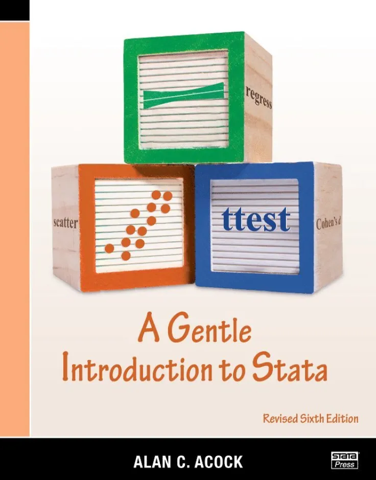 Alan C. Acock’s A Gentle Introduction to Stata, Revised Sixth Edition is aimed at new Stata users who want to become proficient in Stata. After reading this introductory text, new users will be able to not only use Stata well but also learn new aspects of Stata. Acock assumes that the user is not familiar with any statistical software. This assumption of a blank slate is central to the structure and contents of the book. Acock starts with the basics; for example, the part of the book that deals with data management begins with a careful and detailed example of turning survey data on paper into a Stata-ready dataset. When explaining how to go about basic exploratory statistical procedures, Acock includes notes that will help the reader develop good work habits. This mixture of explaining good Stata habits and explaining good statistical habits continues throughout the book. Acock is quite careful to teach the reader all aspects of using Stata. He covers data management, good work habits (including the use of basic do-files), basic exploratory statistics (including graphical displays), and analyses using the standard array of basic statistical tools (correlation, linear and logistic regression, and parametric and nonparametric tests of location and dispersion). He also successfully introduces some more advanced topics such as multiple imputation and multilevel modeling in a very approachable manner. Acock teaches Stata commands by using the menus and dialog boxes while still stressing the value of Stata commands and do-files. In this way, he ensures that all types of users can build good work habits. Each chapter has exercises that the motivated reader can use to reinforce the material. The tone of the book is friendly and conversational without ever being glib or condescending. Important asides and notes about terminology are set off in boxes, which makes the text easy to read without any convoluted twists or forward referencing. Rather than splitting topics by their Stata implementation, Acock arranges the topics as they would appear in a basic statistics textbook; graphics and postestimation are woven into the material naturally. Real datasets, such as the General Social Surveys from 2002, 2006, and 2016, are used throughout the book. The focus of the book is especially helpful for those in the behavioral and social sciences because the presentation of basic statistical modeling is supplemented with discussions of effect sizes and standardized coefficients. Various selection criteria, such as semipartial correlations, are discussed for model selection. Acock also covers a variety of commands available for evaluating reliability and validity of measurements. The revised sixth edition is fully up to date for Stata 17, including updated discussion and images of Stata’s interface and modern command syntax. In addition, examples include new features such as the table command and collect suite for creating and exporting customized tables as well as the option for creating graphs with transparency.