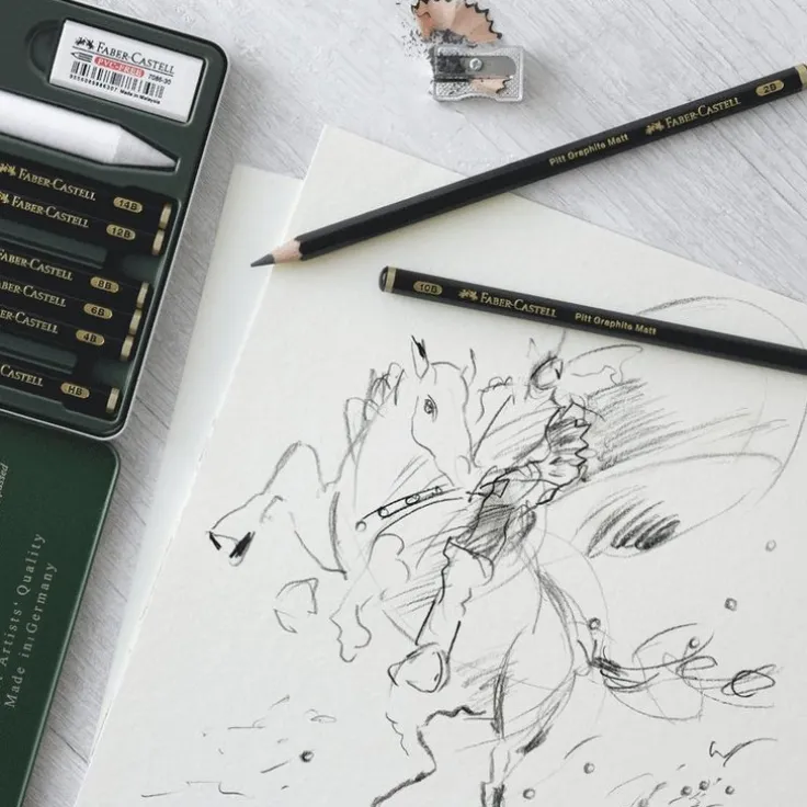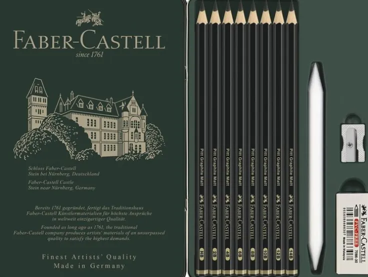 Högkvalitativa grafitpennor i ett perfekt set med 8 olika hårdheter, vässare, radér och stomper. Världens första grafitpenna med extremt matt grafit som innebär att ljuset inte reflekteras i skissen. Perfekt att fota med andra ord. Extra brytsäkert stift tack vare den unika hellimningen. Särskilt lämpat för grafitteckningar, sketching och monochromt skissande. Tillverkade i CO2-neutral produktion med trä från 100% certifierade och hållbara skogar. Miljövänligt och vattenbaserat lack.här.