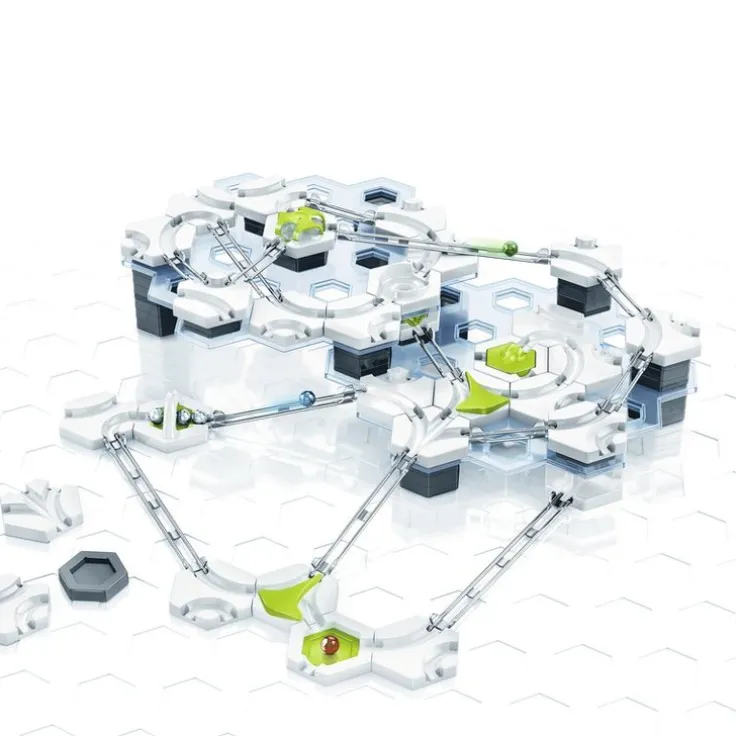 Med GraviTrax® kulbanesystem bygger du egna världar av kulbanor. Med byggelementen skapar du en fartfylld bana som kulorna rullar i mål på. GraviTrax® kulbanesystemet kan göras oändligt större med utökningar och garanterar gränslöst bygg- och spelnöje! För mer information se Gravitrax.com Innehåll: anvisningar, häfte med byggplaner, häfte med uppgifter, 4 bottenplattor, 2 transparenta nivåer, 6 kulor, 40 höjdblock stora, 12 höjdblock små, 21 kurvor, 3 korsningar, 2 växlar, 1 3-in-1, 1 virvel, 1 startblock, 1 magnetisk action-kanon, 3 långa spår, 6 medellånga spår, 9 korta spår, 1 mållinje, 4 basblock, insatser för basblocken: 2 infångare, 1 fritt fall, 1 splash, 1 mål.
