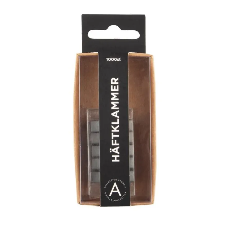 Silverfärgade häftklamrar i 26/6, förpackning om 1000 st. Passar häftapparater med standardmått. Ett måste på hemmakontoret och arbetsplatsen. Häftklamrar ingår i Akademibokhandelns egen kollektion – Kollektion Stora A.