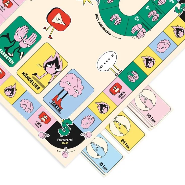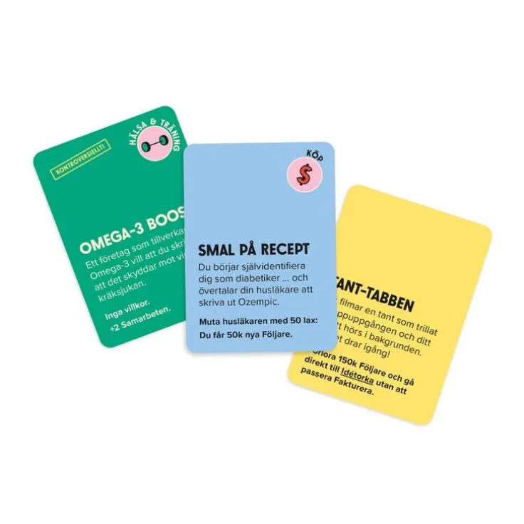 Jakten på en miljon följare!Välkommen till spelet där du gör allt för likes och följare!Du har precis sagt upp dig för att helhjärtat satsa på att bli influencer. Självförtroendet är på topp – du har 200 000 följare och har precis fått betalt för dina två första företagssamarbeten. Med 100 lax på fickan är målet tydligt: Du ska bli Sveriges mäktigaste influencer! Men överlever du i en värld där kändisskapet är en handelsvara och där varje rörelse lika beräknad som den är ängslig? Kan du överträffa dina frenemies utan att förlora din autenticitet? Utmana dig själv och dina vänner i detta skarpt satiriska brädspel och se vem som verkligen har vad som krävs för att dominera influencervärlden.Innehåll:1 spelplan 7 spelpjäser 6 faktureringsbrickor 14 markörer60 händelsekort 60 taktikkort 60 samarbetskort 120 sedlar i blandade valörer 1 tärning 1 regelbok3-6 spelare Speltid 45-90 minuter Rek. ålder från 15 år