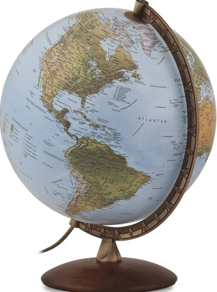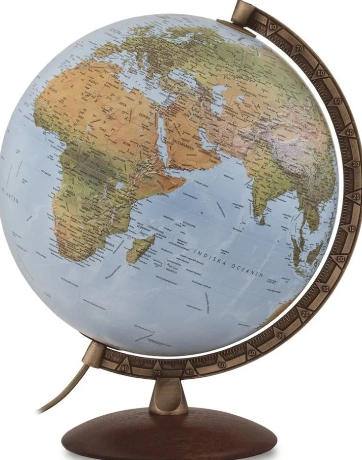 Jordglob 30 cm diameter med svensk text och belysning som visar länderna i olika färger vid tänd glob. Släckt glob visar en geografisk kartbild med miljötyp t.ex. öken och bergskedjor. En vacker och klassisk jordglob med fot i mörkt trä och meridian i mässing.