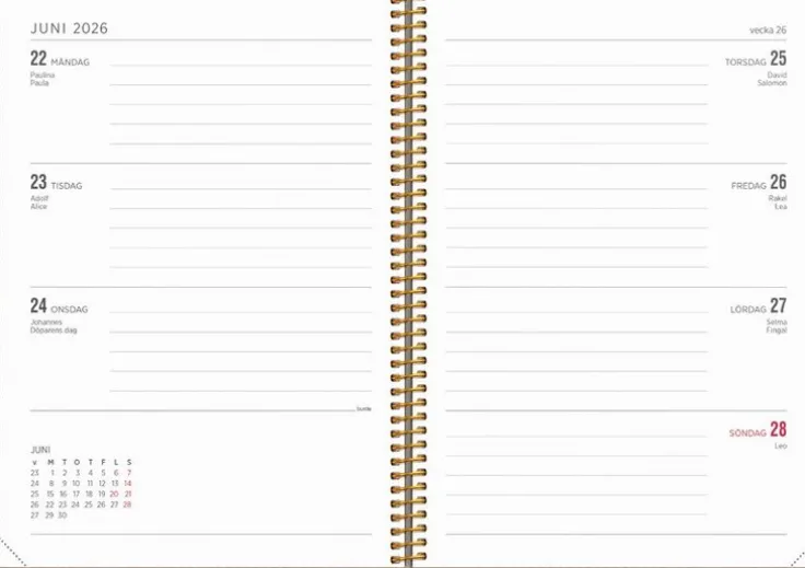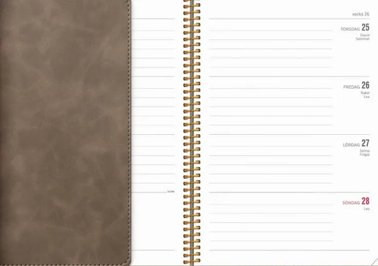 Senator A5 har en liggande layout vilket ger en enkel och överskådlig veckoplanering. Med årsöversikt och årsplanering blir senator A5 ett perfekt verktyg för dig som har mycket på gång eller som ett analogt komplement till dina tekniska lösningar. Check-listor och mindre anteckningsmöjligheter ingår också.Omslaget Twist Mocca är i en sammetsmjuk skinnimitation med en användbar flärp som kan fungera som bokmärke för att enkelt förflytta dig i kalendern. Kalender 25/26 från Burde. Format: A5. Layout: Liggande. Vecka/uppslag. Kalendarium: 2025-06-02 – 2026-07-05. Omslag: Konstläder. Spiralbunden. Innehåll: Årsöversikter, Årsplaner. Antal sidor: 144. Miljöinformation: FSC® papper.