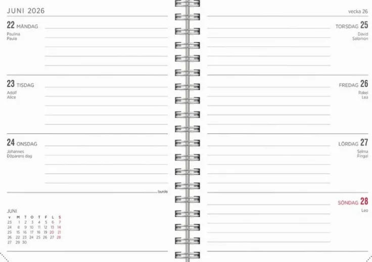 Senator A6 är ett klassiskt uppslag i litet format. En liggande layout ger en enkel och överskådlig veckoplanering. Med årsöversikt och årsplanering blir senator A6 ett perfekt verktyg för dig som har mycket på gång eller som ett analogt komplement till dina tekniska lösningar. Check-listor och mindre anteckningsmöjligheter ingår också.Kalender 25/26 från Burde. Format: A6. Layout: Liggande. Vecka/uppslag. Kalendarium: 2025-06-02 – 2026-07-05. Omslag: Kartong med struktur. Spiralbunden. Innehåll: Årsöversikter, Årsplaner. Antal sidor: 144. Miljöinformation: FSC®.