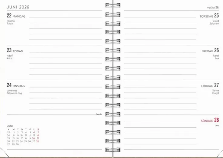 Senator A6 är ett klassiskt uppslag i litet format. En liggande layout ger en enkel och överskådlig veckoplanering. Med årsöversikt och årsplanering blir senator A6 ett perfekt verktyg för dig som har mycket på gång eller som ett analogt komplement till dina tekniska lösningar. Check-listor och mindre anteckningsmöjligheter ingår också. Kalender 25/26 från Burde. Format: A6. Layout: Liggande. Vecka/uppslag. Kalendarium: 2025-06-02 – 2026-07-05. Omslag: Återvunnen kartong. Spiralbunden. Detaljer: Gummiband. Innehåll: Årsöversikter, Årsplaner. Antal sidor: 144. Miljöinformation: FSC®. Omslag i återvunnen kartong.