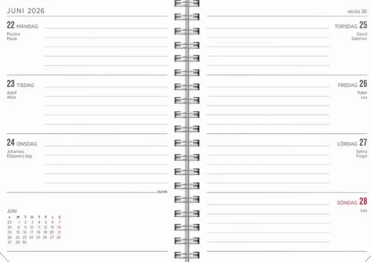 Senator A6 är ett klassiskt uppslag i litet format. Med liggande layout är det fokus på en enkel veckoplanering. Med årsöversikt och årsplanering blir senator A6 ett perfekt verktyg för dig som har mycket på gång eller som ett analogt komplement till dina tekniska lösningar. Check-listor och mindre anteckningsmöjligheter ingår också. Kommer även i ett större A5 format. Omslag i rosa linnetextil med präglat årtal ger ett mjukt och elegant intryck.Kalender 25/26 från Burde. Format: A6. Layout: Liggande. Vecka/uppslag. Kalendarium: 2025-06-02 – 2026-07-05. Omslag: Linnetextil. Spiralbunden. Innehåll: Årsöversikter, Årsplaner. Antal sidor: 144. Miljöinformation: FSC®.
