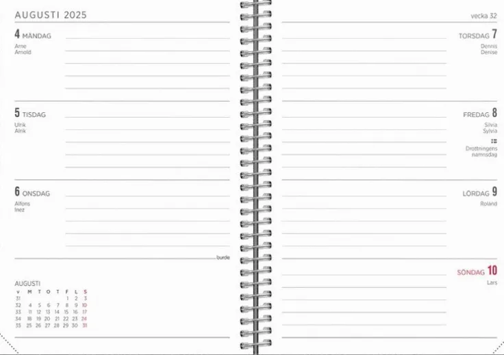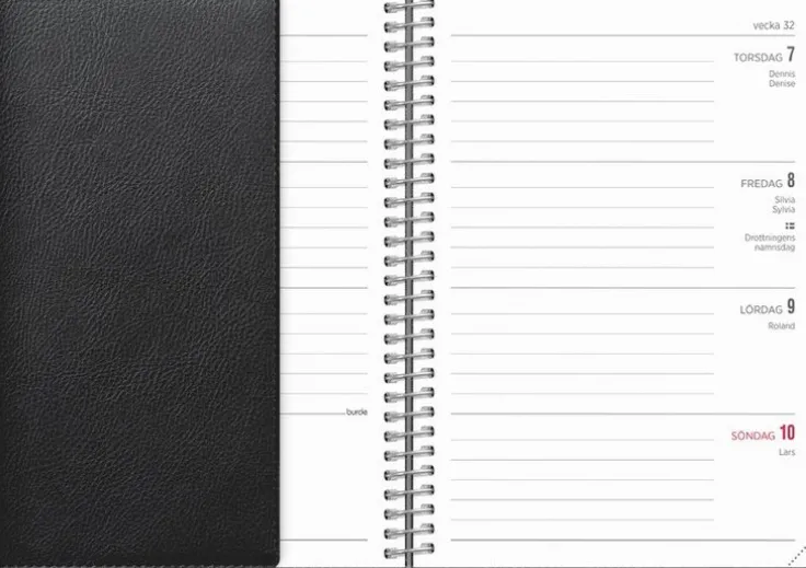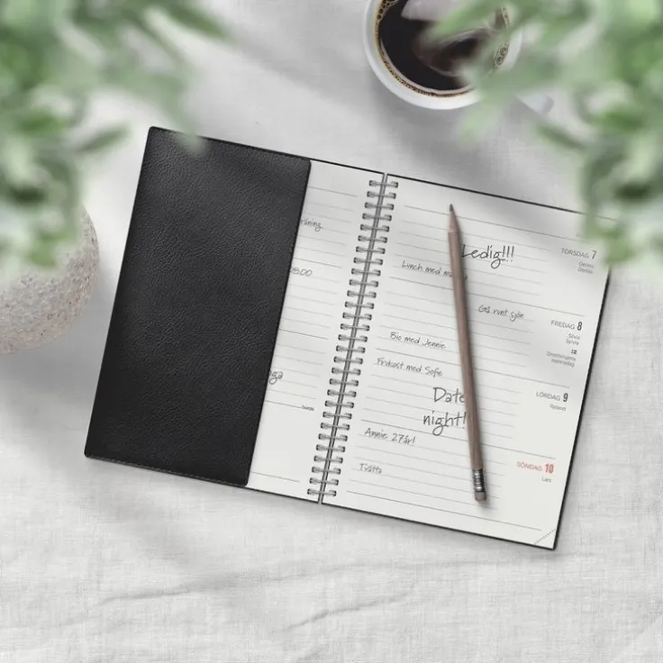 Senator A6 har en klassiskt liggande layout där fokus ligger på en enkel veckoplanering. Med årsöversikt och månadsplanering blir senator A6 ett perfekt verktyg för dig som har mycket på gång eller som ett analogt komplement till dina tekniska lösningar. Check-listor och mindre anteckningsmöjligheter ingår också, liksom en praktisk förvaringsficka. Kommer även i ett större A5 format.Omslaget Twist Svart har en len strukturerad skinnimitation med en användbar flärp som kan fungera som ett bokmärke för att enkelt förflytta dig i kalendern. Kalender 25/26 från Burde. Format: A6. Layout: Liggande. Vecka/uppslag. Kalendarium: 2025-06-02 – 2026-07-05. Omslag: Konstläder. Spiralbunden. Innehåll: Årsöversikter, Årsplaner. Antal sidor: 144. Miljöinformation: FSC® papper.
