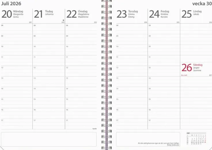 Format: A5. Layout: Stående. Vecka/uppslag. Timindelning 8-17. Kalendarium: 2025-06-02 – 2026-08-30. Omslag: Kartong. Spiralbunden. Antal sidor: 176. Miljöinformation: FSC®. Tillverkad i EU.