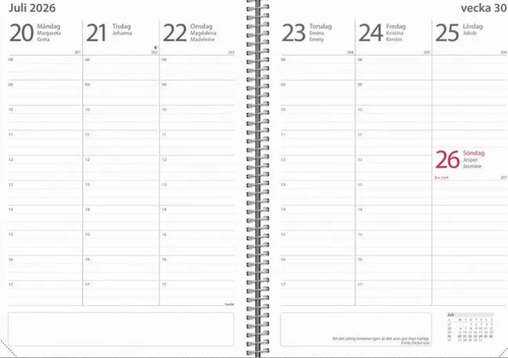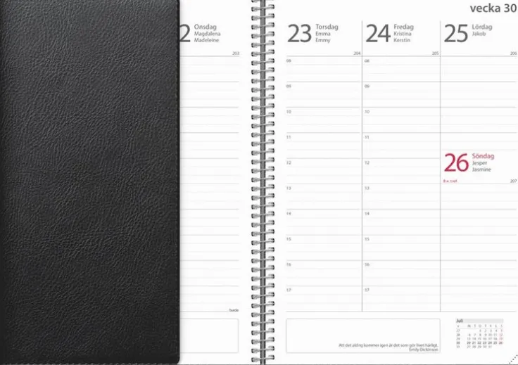 Study A5 är en praktisk kalender för den studerande. Med en stående layout samt timindelning 8-17 hjälper kalendern dig att behålla strukturen genom hela läsåret. Det finns även utrymme för att skriva upp årsplaner, scheman och provresultat för att lättare kunna reflektera över akademisk utveckling. För att underlätta organiseringen har Study även en praktisk förvaringsficka. Allt du behöver för ett framgångsrikt läsår!Omslaget Twist Svart har en len strukturerad skinnimitation med en användbar flärp som kan fungera som ett bokmärke för att enkelt förflytta dig i kalendern.Kalender 25/26 från Burde. Format: A5. Layout: Stående. Vecka/uppslag. Timindelning 8-17. Kalendarium: 2025-06-02 – 2026-08-30. Omslag: Konstläder. Spiralbunden. Innehåll: Schema, Provresultat, Årsplaner. Antal sidor: 176. Miljöinformation: FSC® papper.