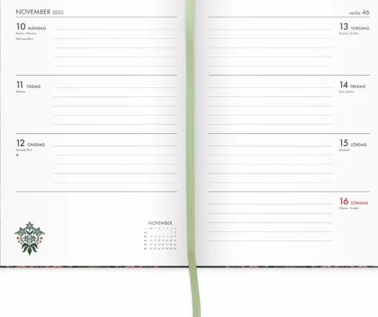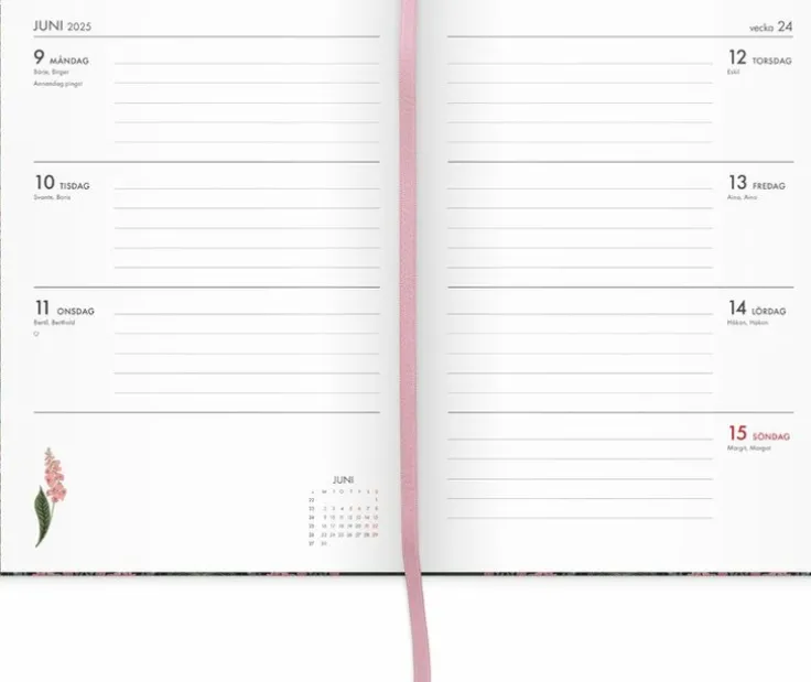 Hanna Wendelbo är designer och formgivare som ritar mönster för tyger, tapeter, kläder och nu även för kalendrar. Hon har även gett ut böcker om blommor, kreativitet och odling.Varje månad presenterar Hanna ett litet projekt, något som kanske sätter igång din kreativitet och gör tid för skapande. Det kan vara att pressa blommor och dekorera vackra småkakor med dem, att uppmärksamma alla hjärtansdag, eller lysa upp oktobers mörka kvällar med en vacker pumpa. Kalendern innehåller liggande veckouppslag med en vecka per uppslag. Varje månad börjar med månadens projekt samt ett uppslag för anteckningar. Anteckningssidorna i varje månadsuppslag samt i slutet av kalendern innehåller alternerande olinjerade, linjerade, dottade och rutade sidor som du kan använda för dina anteckningar, skisser och planering. Kalendern har gummiband runt omslaget samt två märkband inuti kalendern. Kalendern innehåller årsplan samt årsöversikt. Format: A5. Layout: Vecka/Uppslag. Omslag: Strukturerad kartong. Inbunden. Miljöinformation: FSC®.