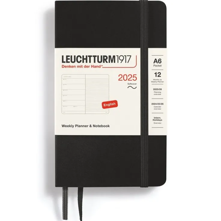 Kalender 2025 Leuchtturm1917 i A6-format med mjuk pärm, Weekly Planner & Notebook med veckans dagar på vänster sida och linjerat anteckningsblad på den högra sidan av ett uppslag – kalender och anteckningsbok i ett. Kraftig förvaringsficka längst bak. Dubbla märkband. Informationssidor med bl a internationella helgdagar i 58 länder, vilket gör det lätt att hitta helgdagar i sitt eget land, praktiskt även vid planering av resor. Projektplaneringsblad. Perforerade avrivningsbara sidor för anteckning. Praktisk resårsnodd som håller ihop kalendern. FSC-certifierat papper. Färg: Black