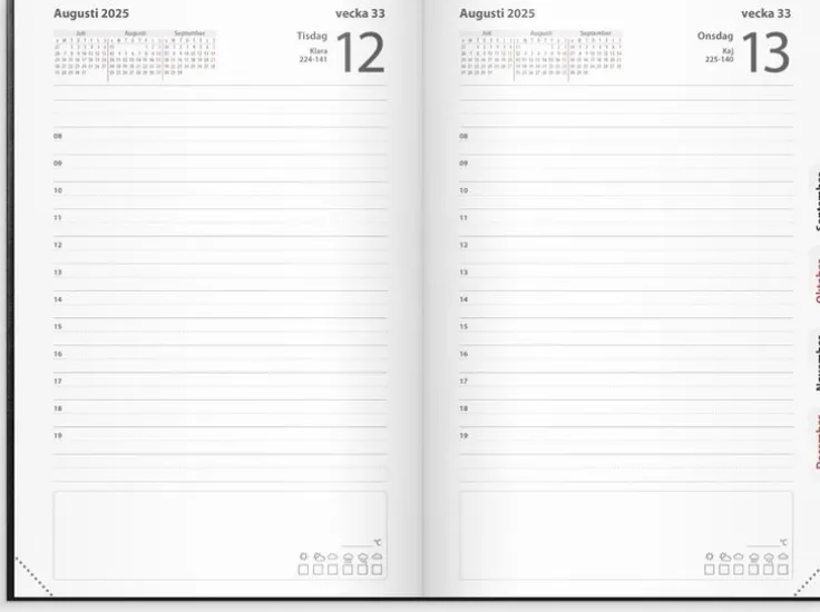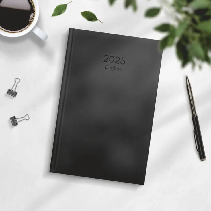 Kalender 2025 från Burde. Format: 135×205 mm. Layout: Dag/sida. Timindelning 8-19. Kalendarium: 2025-01-01 – 2025-12-31. Omslag: Konstläder. Inbunden. Detaljer: Märkband. Innehåll: Årsöversikter, årsplaner, urstansat månadsregister. Antal sidor: 400. Miljöinformation: FSC® papper.