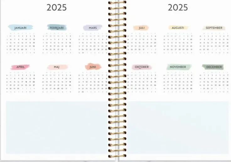 All planering för familjen i en och samma kalender! Belöningsmodul för att notera framstegen mot veckomål. Plats för veckans matsedel. I slutet av kalendern finns kom ihåg-, check- och att göra-listor m.m. Stickersarken gör planeringen ännu roligare!Kalender 2025 från Burde. Format: 163×229 mm. Layout: Liggande. Vecka/uppslag. Kalendarium: 2024-12-30 – 2026-01-04. Omslag: Kartong med struktur. Spiralbunden. Detaljer: Pappersficka. Innehåll: Årsöversikter, årsplan, anteckningssidor, stickersark. Antal sidor: 176. Miljöinformation: FSC®.
