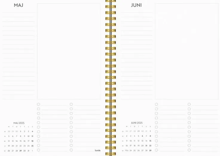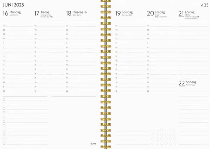 Stilren kalender som har det som behövs för att planera veckan och få ordning på vardagslivet. Tydliga klockslag, 7-22, gör att du lätt kan planera in rätt tider för aktiviteter och kom ihåg. Kalendern är neutral i svartvita färger.Kalender 2025 från Burde. Format: A5. Layout: Stående. Vecka/uppslag. Timindelning 7-22. Kalendarium: 2024-12-16 – 2026-01-04. Omslag: Kartong med struktur. Spiralbunden. Detaljer: Gummiband. Flyttbara markörer. Pappersficka. Innehåll: Årsöversikter, årsplan, anteckningssidor. Antal sidor: 160. Miljöinformation: FSC®.