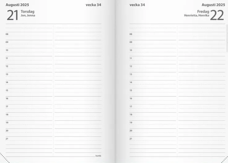 Kalender 2025 från Burde. Format: A6. Layout: Dag/sida. Timindelning 8-21. Kalendarium: 2025-01-01 – 2025-12-31. Omslag: Konstläder. Inbunden. Innehåll: Årsöversikt, årsplaner. Antal sidor: 400. Miljöinformation: FSC®.