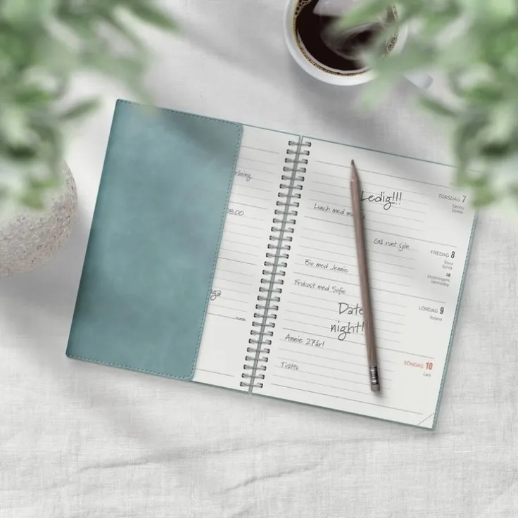 Kalender med mjuk pärm i konstläder med den populära flärpen som kan användas som bokmärke. Ett klassiskt uppslag med liggande layout där fokus ligger på tydlig veckoplanering. Inlagans layout passar dig som har mycket på gång, oavsett veckodag. Kalendern är liten och enkel och med lika mycket utrymme för både vardag och helg.Kalender 2025 från Burde. Format: A6. Layout: Liggande. Vecka/uppslag. Kalendarium: 2024-12-09 – 2026-01-04. Omslag: Konstläder. Spiralbunden. Innehåll: Årsöversikter, årsplaner. Antal sidor: 144. Miljöinformation: FSC® papper.