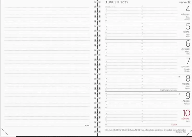 Kalender 2025 från Burde. Format: A5. Layout: Liggande. Vecka/uppslag. Timindelning 8-17. Kalendarium: 2024-12-23 – 2026-01-04. Omslag: Plast. Spiralbunden. Innehåll: Årsöversikter, årsplaner, linjerade vänstersidor, internationella helgdagar, löst telefonblad. Antal sidor: 112. Miljöinformation: FSC®.