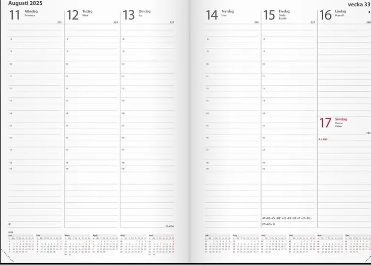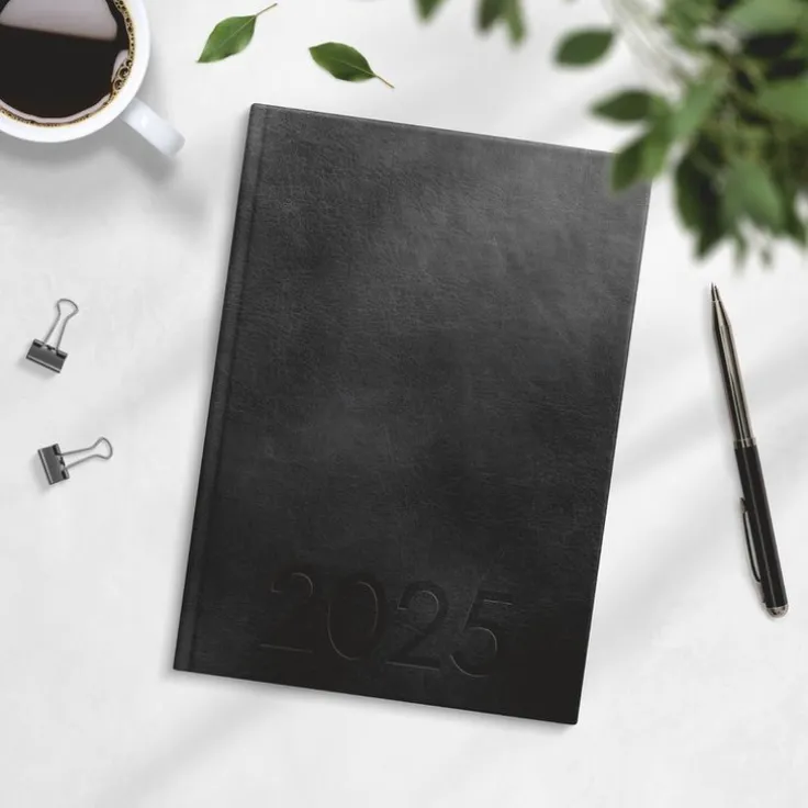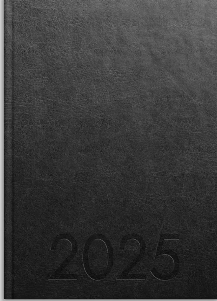 Kalender 2025 från Burde. Format: A5. Layout: Stående. Vecka/uppslag. Timindelning 8-19. Kalendarium: 2024-12-09 – 2026-01-04. Omslag: Konstläder. Inbunden. Detaljer: Märkband. Innehåll: Årsöversikter, årsplaner, årsöversikt på varje uppslag, internationella helgdagar. Antal sidor: 144. Miljöinformation: FSC® papper.