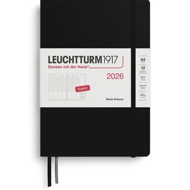 Kalender 2026 Leuchtturm1917 i A5-format med inbunden inlaga och hård pärm, Week Planner, en hel vecka per uppslag med gott om utrymme för daglig planering och organisering. Innehåller detaljer som 3 års årsöversikt, årsplanering 2026 & 2027, projektplanering, , kraftig förvaringsficka och avrivningsbara sidor längst bak, 2 märkband, internationella helgdagar vilket gör det lätt att hitta helgdagar i sitt eget land, praktiskt även vid planering av resor. Praktisk resårsnodd som håller ihop kalendern. FSC-certifierat och syrafritt papper. Färg: Black