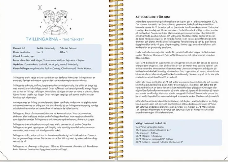 Bjud in astrologin i ditt liv! Ett nytt år står för dörren. Är du redo att börja följa ditt astrologiska flöde? Låt 2026 bli det år då du använder astrologin för att ta vara på dina möjligheter!Du får råd om när du ska öka tempot och när du behöver ta det lugnt. Astrologi kan tillämpas på olika områden, både på det stora i livet och på aspekter som kärlek, hälsa, ekonomi, karriär och din personliga utveckling. I den här A5 veckokalendern kommer du att lära dig hur du kan följa ditt eget stjärnteckens inflytande varje vecka och månad under året. I kalendern kommer du att lära dig om astrologi och om dig själv! Den är utformad för att du ska kunna använda den för att skapa det bästa möjliga 2026! Så att du kan göra rätt saker vid rätt tidpunkt och förstå det energiflöde som omger dig. Varje månad kommer du att kunna läsa om hur nymånens och fullmånens påverkan kan påverka dig. Det kommer att hjälpa dig att ta nya steg vid nymånen och avsluta projekt vid fullmånen.>Kalender 2026 från Burde. Format: A5. Layout: Stående. Vecka/uppslag. Timindelning 8-18. Kalendarium: 2025-12-22 – 2027-01-03. Omslag: Kartong med struktur. Spiralbunden. Innehåll: Flaggdagar, helgdagar/aftnar, månfaser, namnsdagar, temadagar/händelser, årsöversikt/årsöversikter, faktatexter om astrologi, anteckningsyta. Antal sidor: 176. Miljöinformation: FSC®.