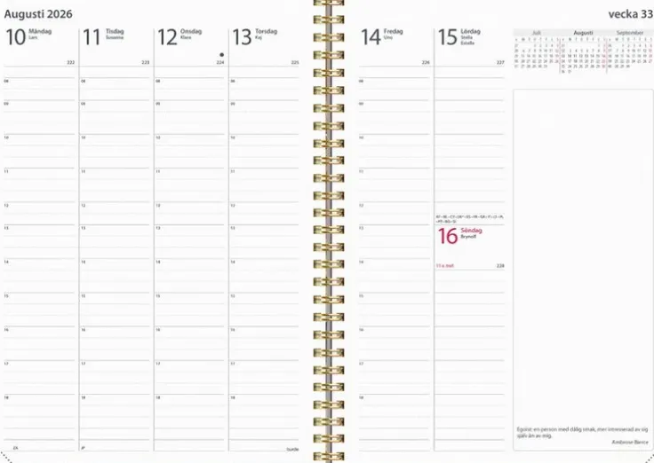 Kalendern har ett naturinspirerat motiv med detaljer i guldfolie som gör det lilla extra. Att ha flyt på jobbet handlar till stor del om konsten att planera Det här är kalendern för dig som vet att arbetsdagen lätt blir hektisk och snabbt fylls på med möten och uppgifter, och vill ha bra översikt över din veckoplanering. När du vet vad som väntar varje dag blir du mer effektiv och chansen är större att du når dina mål.>Kalender 2026 från Burde. Format: A5. Layout: Stående. Vecka/uppslag. Timindelning 8-18. Kalendarium: 2025-11-24 – 2027-01-03. Omslag: Kartong med struktur. Spiralbunden. Detaljer: Gummiband. Pappersficka. Innehåll: Kyrkliga helgdagar, flaggdagar, helgdagar/aftnar, internationella helgdagar, månfaser, namnsdagar, internationella helgdagar översikt, temadagar/händelser, årsöversikt/årsöversikter, årsplan/årsplaner,. Antal sidor: 144. Miljöinformation: FSC®.