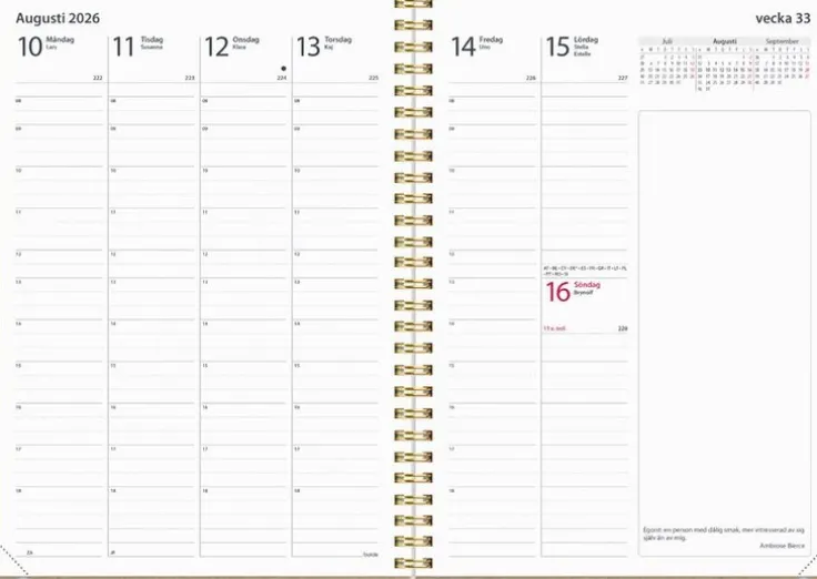 En kalender med ett omslag i återvunnen kartong och guldprägling. Att ha flyt på jobbet handlar till stor del om konsten att planera. Det här är kalendern för dig som vet att arbetsdagen lätt blir hektisk och snabbt fylls på med möten och uppgifter, och vill ha bra översikt över din veckoplanering. När du vet vad som väntar varje dag blir du mer effektiv och chansen är större att du når dina mål.>Kalender 2026 från Burde. Format: A5. Layout: Stående. Vecka/uppslag. Timindelning 8-18. Kalendarium: 2025-11-24 – 2027-01-03. Omslag: Återvunnen kartong. Spiralbunden. Detaljer: Gummiband. Pappersficka. Innehåll: Kyrkliga helgdagar, flaggdagar, helgdagar/aftnar, internationella helgdagar, månfaser, namnsdagar, internationella helgdagar översikt, temadagar/händelser, årsöversikt/årsöversikter, årsplan/årsplaner,. Antal sidor: 144. Miljöinformation: FSC®. Omslag i återvunnen kartong.
