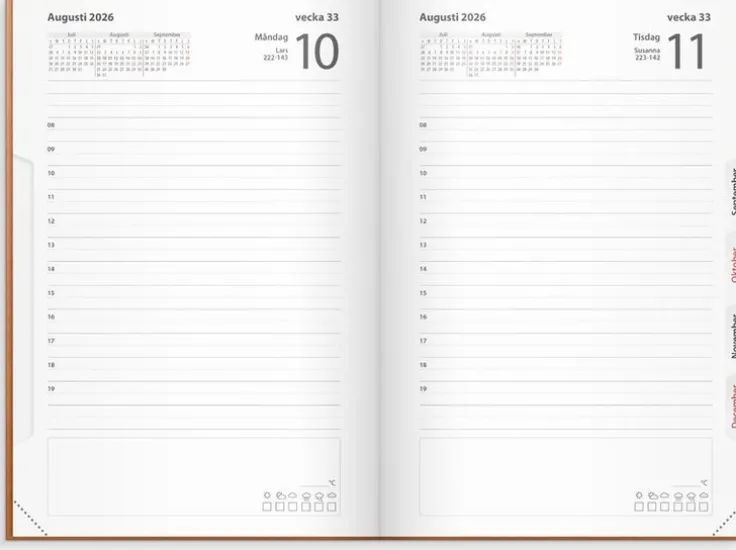 Kalender 2026 från Burde. Format: 135×205 mm. Layout: Dag/sida. Timindelning 8-19. Kalendarium: 2026-01-01 – 2026-12-31. Omslag: Konstläder. Inbunden. Detaljer: Märkband. Innehåll: Kyrkliga helgdagar, flaggdagar, helgdagar/aftnar, månfaser, namnsdagar, internationella helgdagar översikt, temadagar/händelser, årsöversikt/årsöversikter, årsplan/årsplaner, urstansat månadsregister. Antal sidor: 400. Miljöinformation: FSC® papper.