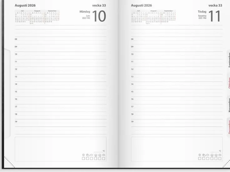 Kalender 2026 från Burde. Format: 135×205 mm. Layout: Dag/sida. Timindelning 8-19. Kalendarium: 2026-01-01 – 2026-12-31. Omslag: Konstläder. Inbunden. Detaljer: Märkband. Innehåll: Kyrkliga helgdagar, flaggdagar, helgdagar/aftnar, månfaser, namnsdagar, internationella helgdagar översikt, temadagar/händelser, årsöversikt/årsöversikter, årsplan/årsplaner, urstansat månadsregister. Antal sidor: 400. Miljöinformation: FSC® papper.